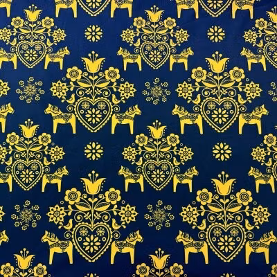 Dala blå gul, bomullsjersey 95% bomull 5% elastan ca 150 m bred Vikt 200 gr/m2 GOTS-certifierad bomull Max tvätttemperatur 40° 2 prickar på strykjärn Tyget säljs per decimeter. 1=1dm, 10=1m Minsta beställningsmått är 5dm