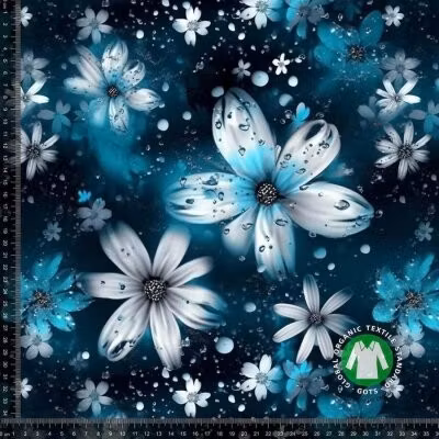 vita blommor på blå/svart bakgrund 95% bomull 5% elastan Ca 150 cm bred 200g/m2 GOTS-certifierat Max tvätttemperatur 30° 1 prick på strykjärn Tyget säljs per decimeter. 1=1dm, 10=1m Minsta beställningsmått är 5dm