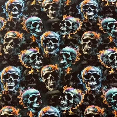 Dödskallar med eld bomullsjersey 95% bomull 5% elastan Ca 150 cm bred 220g/m2 GOTS-certifierat Max tvätttemperatur 30° 1 prick på strykjärn Tyget säljs per decimeter. 1=1dm, 10=1m Minsta beställningsmått är 5dm